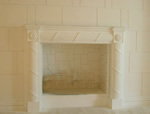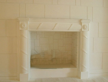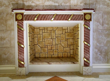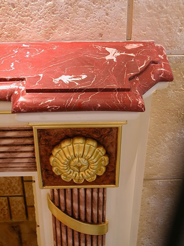 Τζάκι απο γύψο ζωγραφισμένο με λαδομπογίες και φυλλα χρυσού.Το καπάκι είναι κατασκευασμένο απο γυψομάρμαρο (scagliola) κόκκινου χρώματος με λευκά νερά.